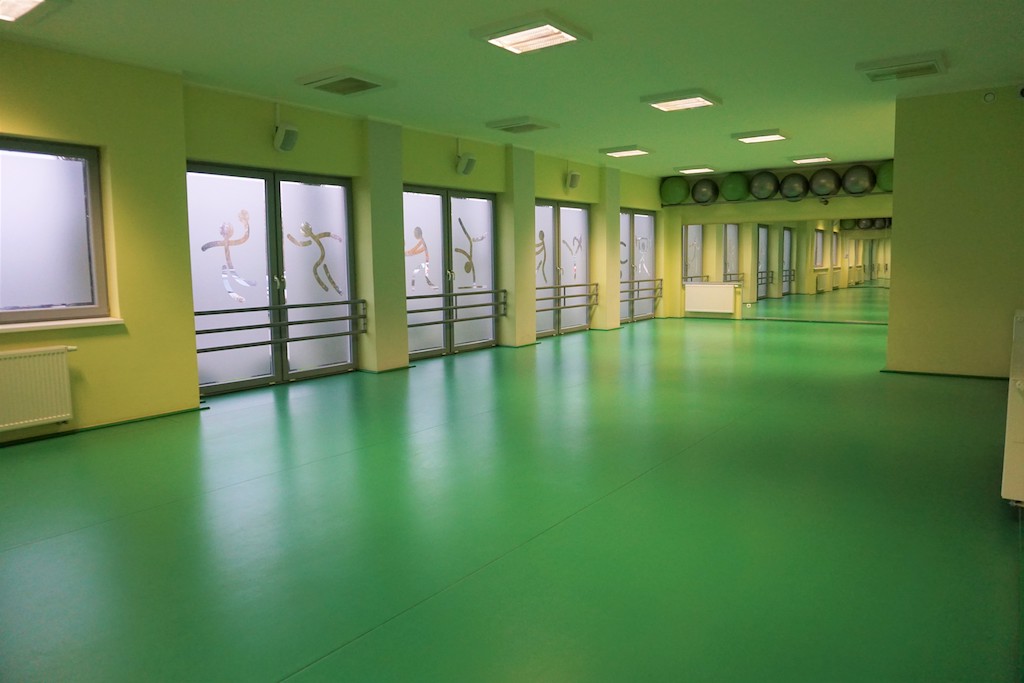 Sala fitness (113 m2) to profesjonalnie przystosowane pomieszczenie do ćwiczeń i zajęć typu fitness, dance, crossfit i innych. Wyłożona specjalnym gumowym i amortyzującym podłożem, wyposażona w lustra oraz nagłośnienie.