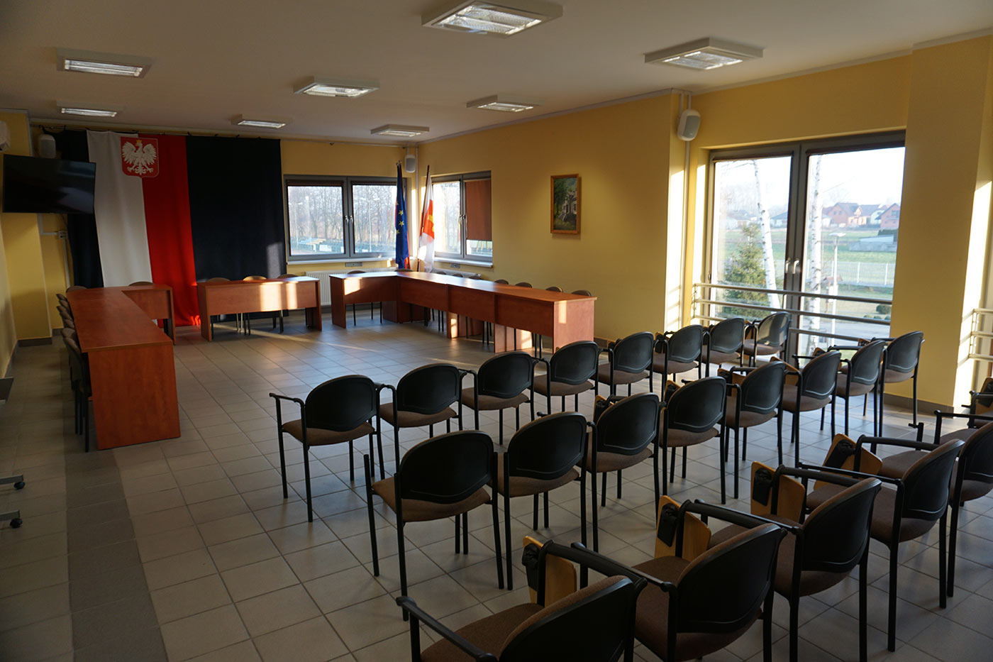 Sala konferencyjna – sala o powierzchni 76m2 wyposażona w rzutnik, projektor, nagłośnienie konferencyjne oraz meble biurowe.